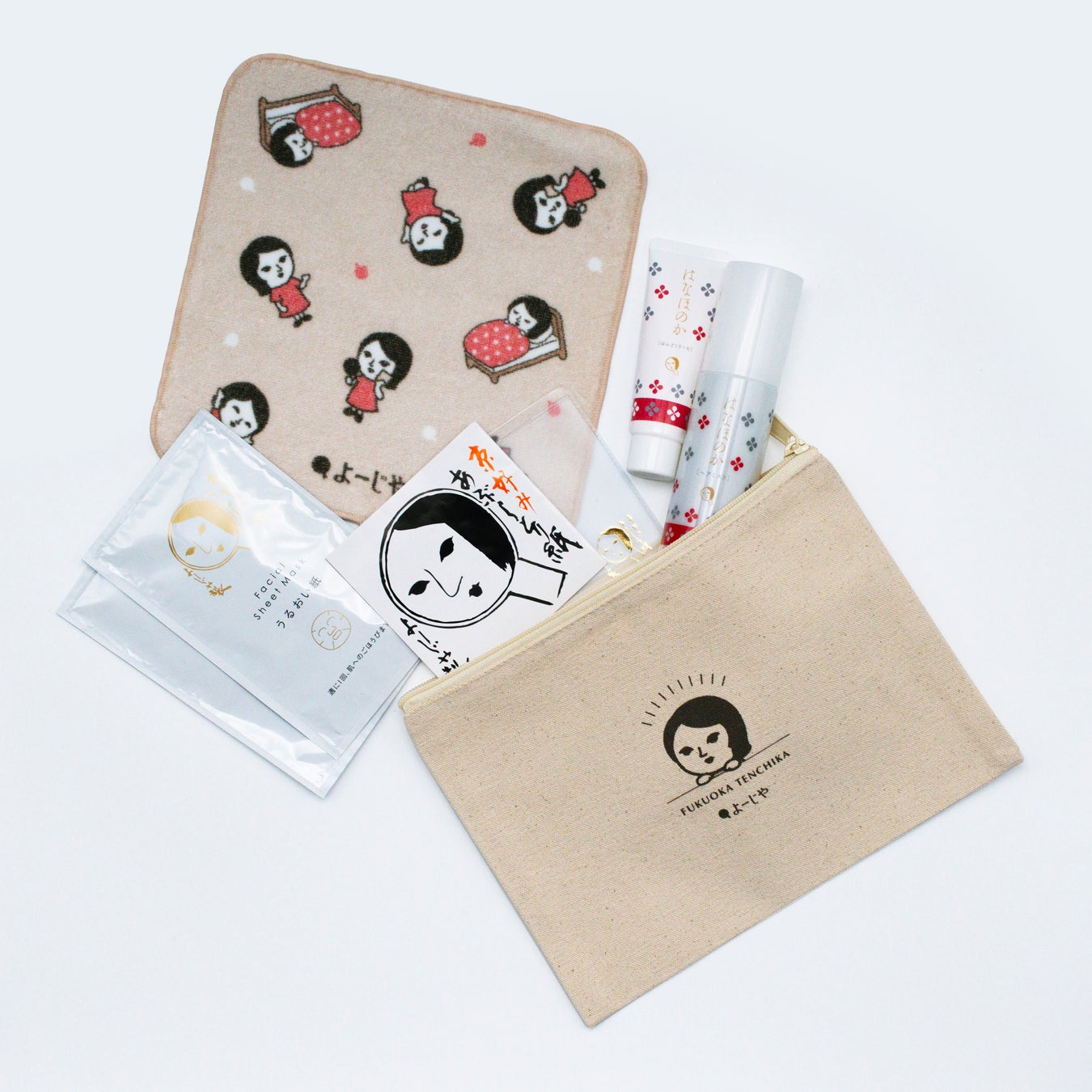 「よじこ」デザインの限定ポーチに人気アイテムを詰め込んだ「天神地下街店 オープン記念セット」を販売いたします。上品で華やかなフルーティフローラルの香りが特長の「はなほのか」シリーズをはじめ、スキンケアアイテムや雑貨などを一度に試せる特別なセットです。