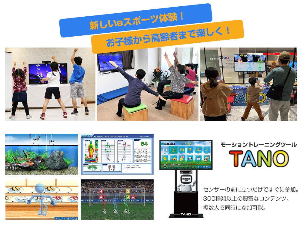 「TANO」は、センサーの前に立つだけで体がコントローラーとなり、約300種類以上の運動・認知・発声トレーニングをゲーム感覚で体験できる次世代の福祉機器です。また、TANOのコンテンツはeスポーツ的な競技性も兼ね備えており、得点を競ったりチームで協力したりすることで、世代を超えた盛り上がりを生み出します。年齢を問わず誰でも気軽に楽しめるため、スポーツイベントにおいても交流や健康づくりの場を広げます。