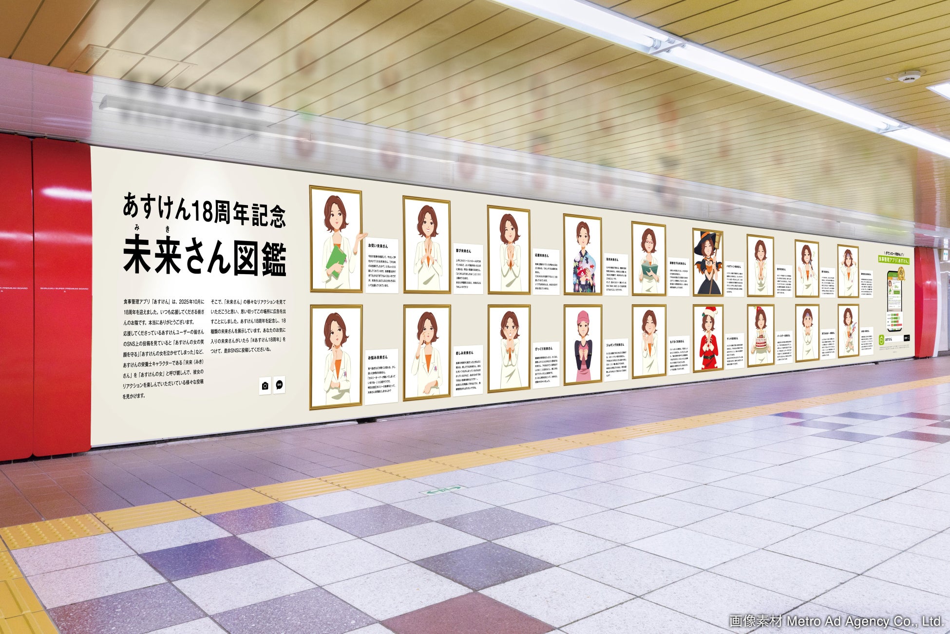 当社の創業18周年にちなみ、『あすけん』の栄養士キャラクター「未来さん」の18種類の表情やポーズを集めた、あすけん18周年記念「未来さん図鑑」ピールオフ広告を、東京メトロ新宿駅メトロプロムナードにて期間限定で掲出します。