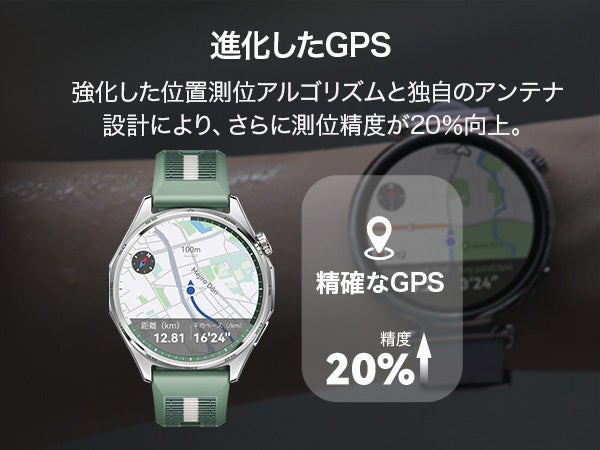 特に、サイクリングでは業界初となるウォッチ単体で自分のサイクリングパワーの試算が可能です。測位衛星精度も前モデル『HUAWEI WATCH GT 5』比で約20%向上しており※2、フルカラーマップで自分の位置や目標地点を確認しながらワークアウトを進めることができます。最大輝度3000ニト※3で屋外でも明るく見やすい大きなディスプレイです。
