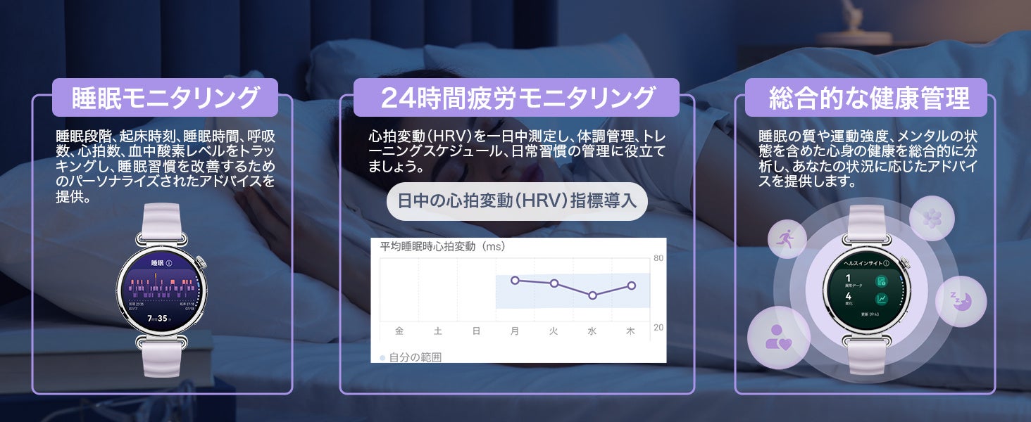 健康管理機能では、進化した多次元センシングシステム「HUAWEI TruSense」により、12段階で情緒の状態をお知らせする情緒モニタリングをはじめとして、詳細かつ精度高い睡眠モニタリング機能を搭載。心拍数・血中酸素レベル・皮膚温・心拍変動(HRV)も24時間測定可能です※4。