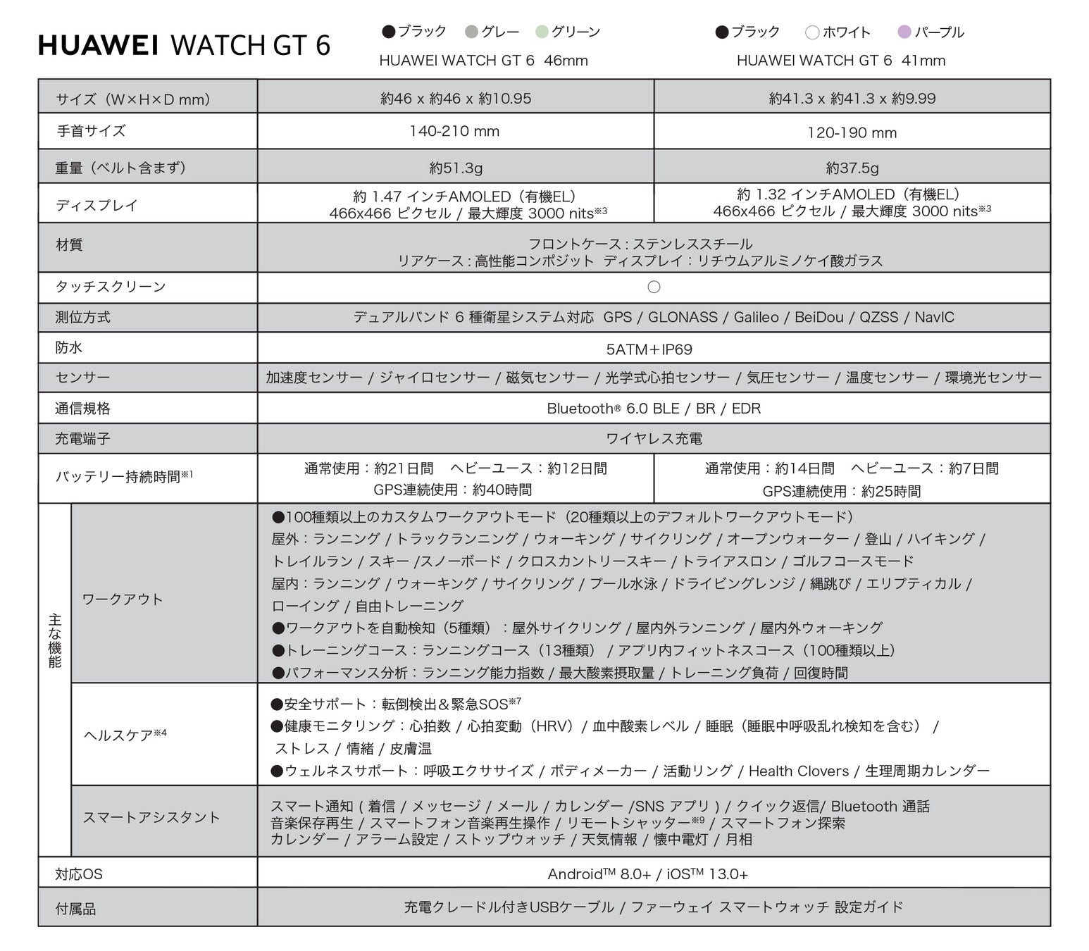 ※1:HUAWEI WATCH GT 6 46 mm: バッテリーは通常使用で約21日間、ヘビーユースで約12日間、常時点灯機能使用時で約7日間、GPS連続使用時で約40時間持続します。HUAWEI WATCH GT 6 41 mm: バッテリーは通常使用で約14日間、ヘビーユースで約7日間、常時点灯機能使用時で約5日間、GPS連続使用時で約25時間持続します。