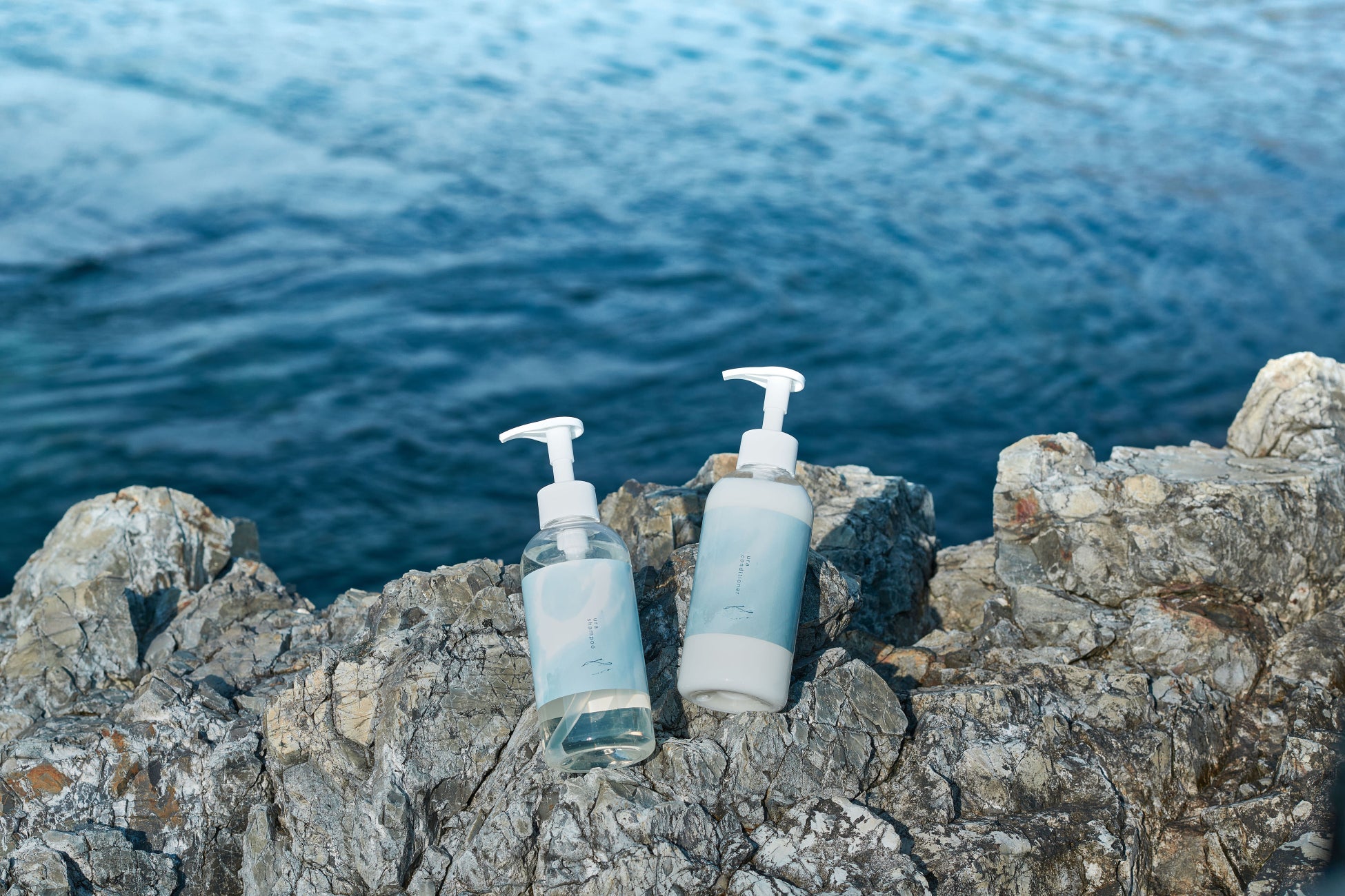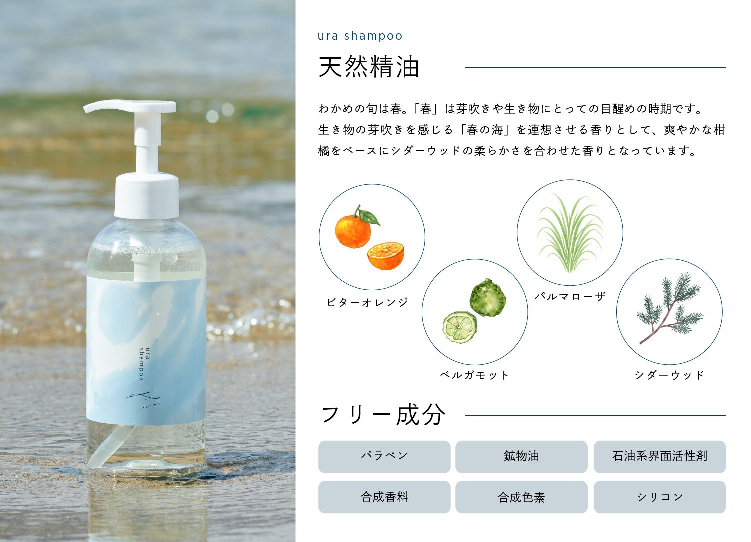 「ura shampoo」「ura conditioner」は天然由来成分94% / 87%と高配合(わかめ・柚子・マジョラム・ローズマリー等)で設計し、化学成分や人工香料は極力使用せず、春の海をイメージした爽やかな香りに仕上げています。