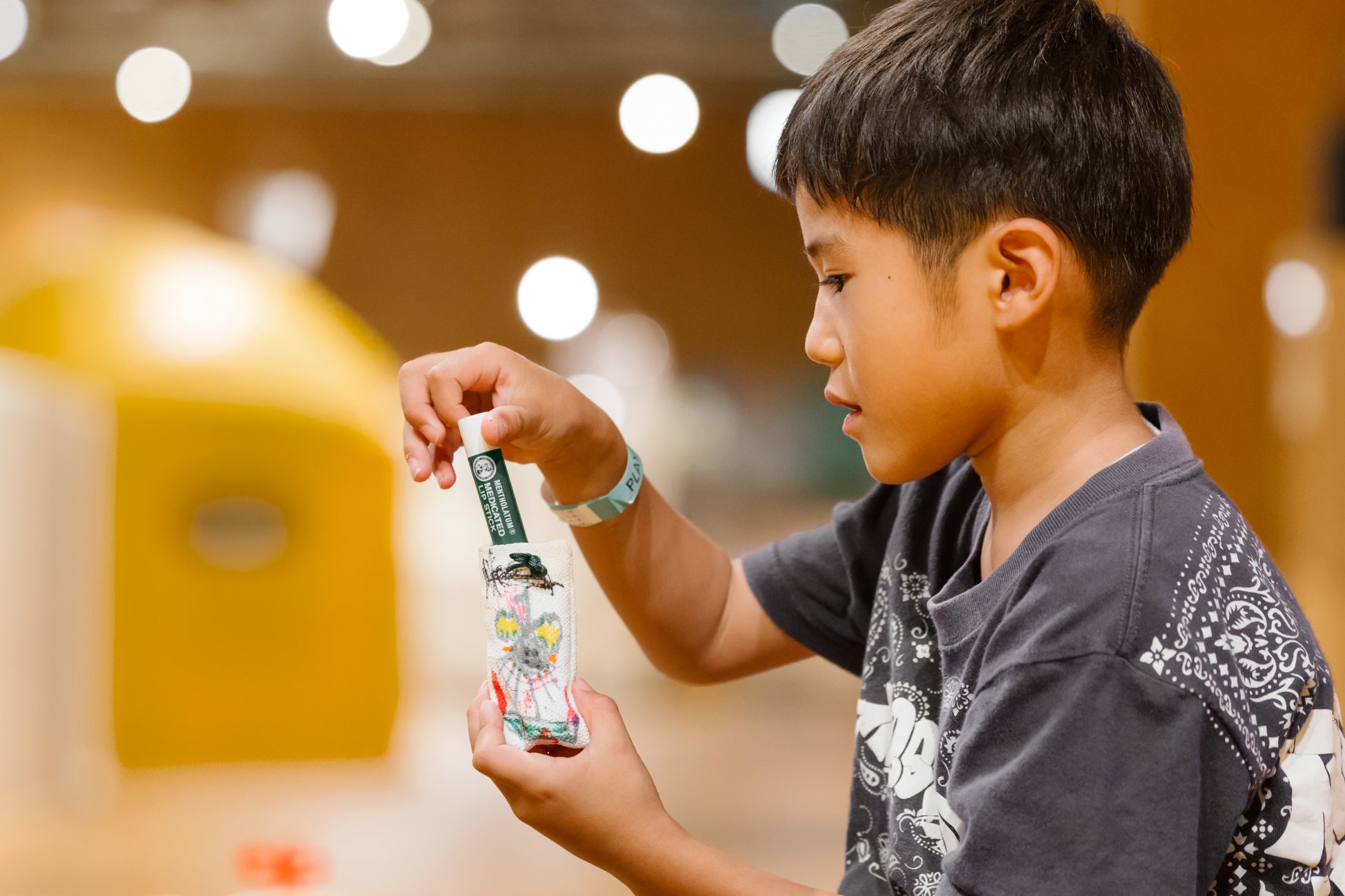 1,500本以上のリップケースを、自由に積んだり並べたり、文字を作ったりして遊べるコーナーです。自分だけの遊び方を発見できます。