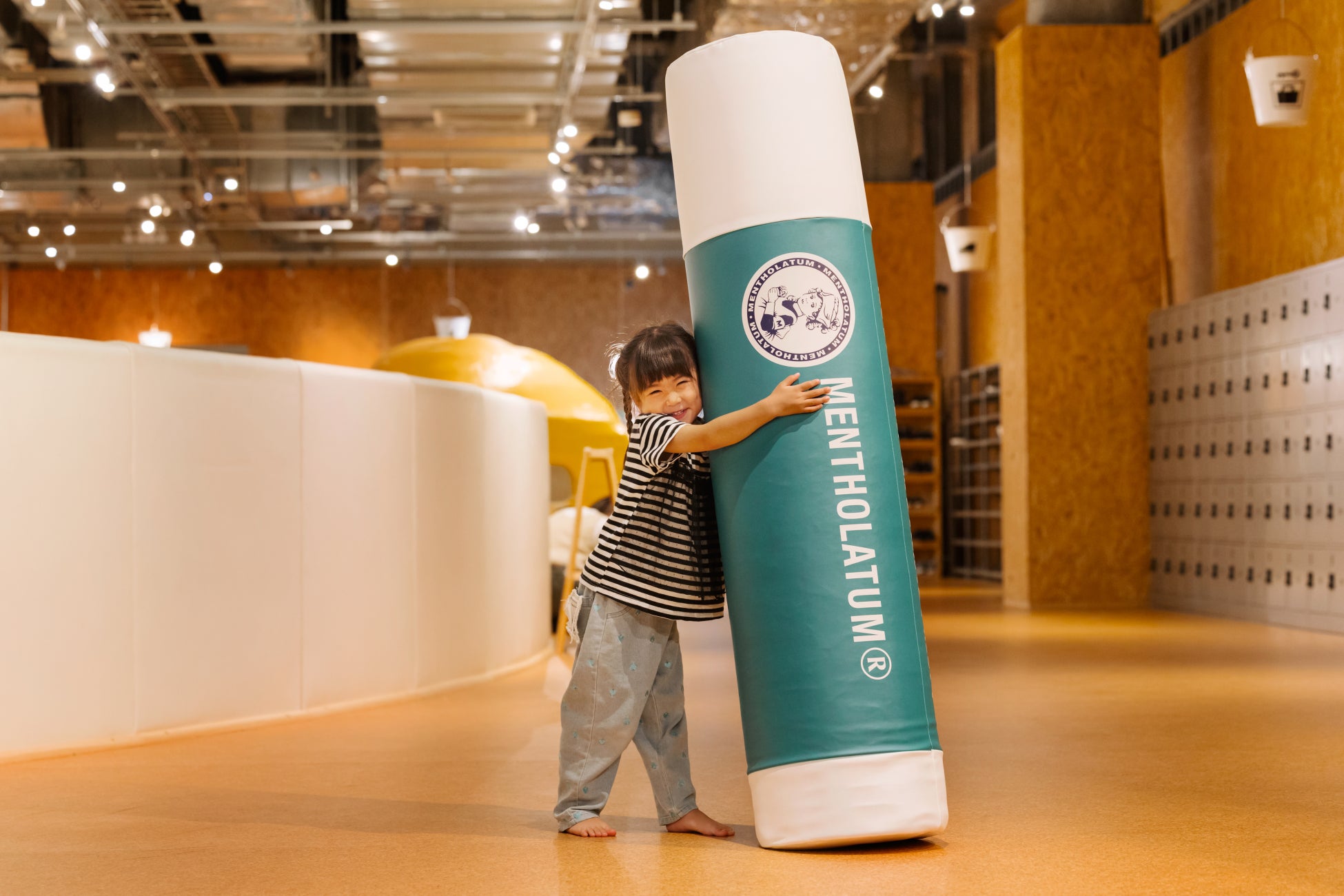 メンソレータムリップの形をした、全長約333㎝のトンネルが登場します。中はスポンジ敷きで柔らかく、安心して遊べます。子どもは寝転んだり、通り抜けたりでき、顔を出して撮影すればインパクトのある写真が撮れます。