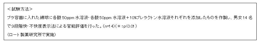 綿球に悪臭成分の酸を添加したものと悪臭成分+プレラクトンの混合物を添加したものを用いて9段階快・不快度表示法を行ったところ、悪臭成分とプレラクトンの混合物では優位に不快度が減少することが確認されました。(図4)