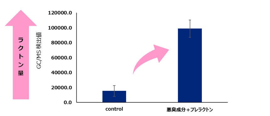 悪臭成分の酸の混合物(酢酸、イソ吉草酸、イソ酪酸、4-メチル-3-ヘキセン酸)にプレラクトンを添加したところ、コントロール(水)を添加したものと比較して、ラクトンの量が優位に増加することが確認されました。(図3)
