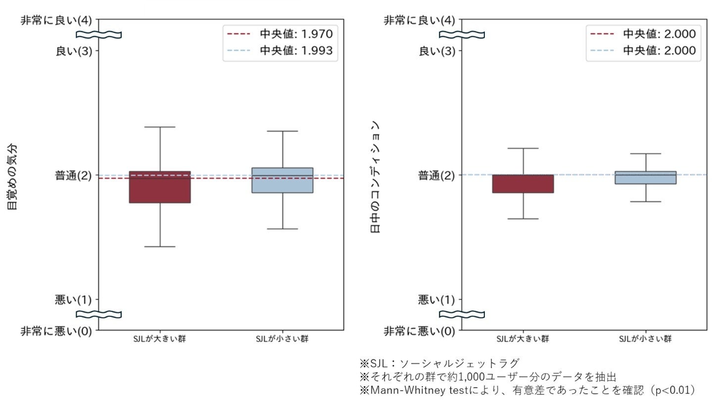 ソーシャルジェットラグの大きい群(上位30%)の方が、小さい群(下位30%)と比較して、目覚めの気分スコア、日中のコンディションスコアが統計上有意に低いことが明らかになりました。