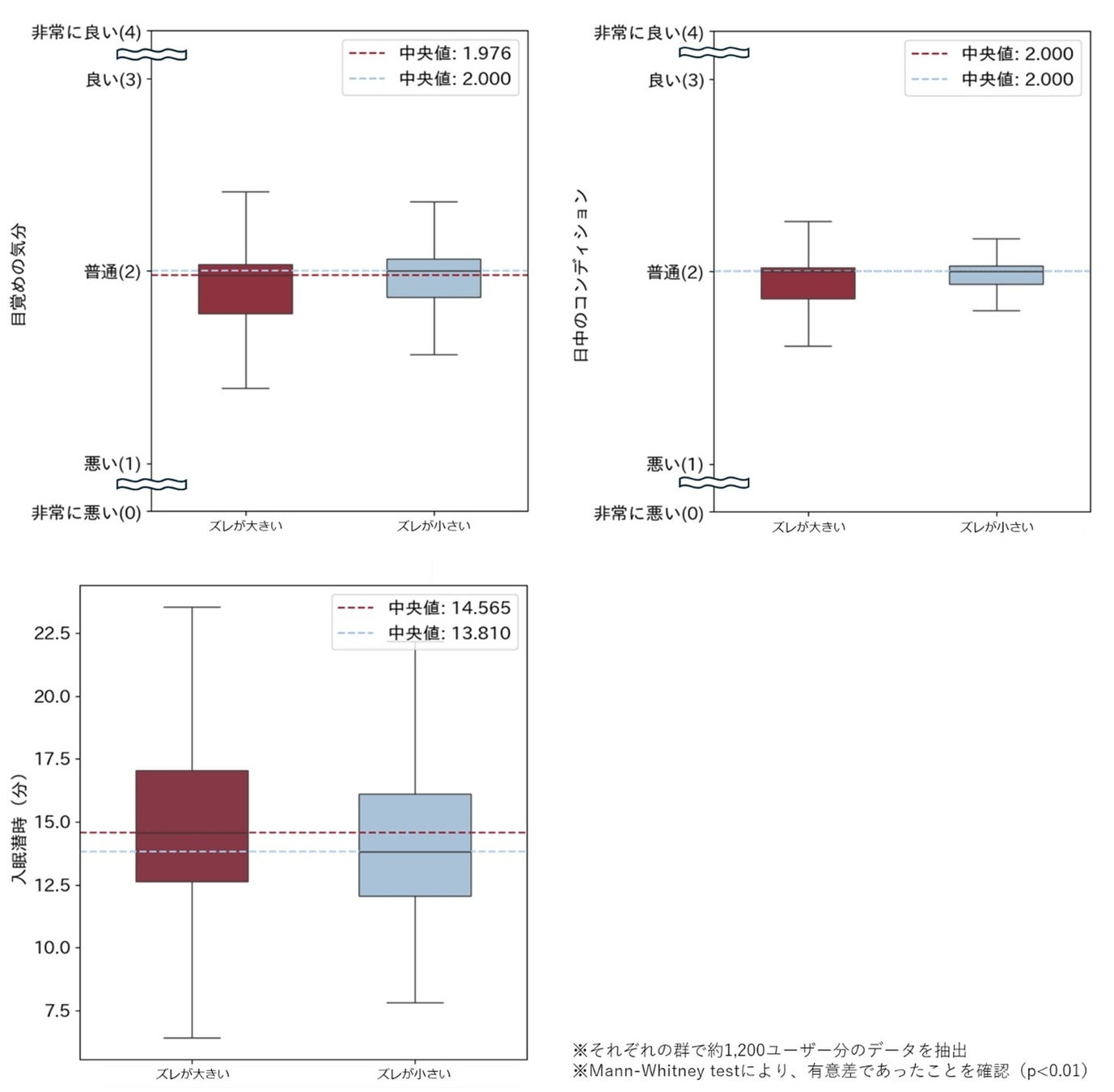 解析方法 :全データの睡眠中央時間※1を算出して、①平日と休日の睡眠中央時間のズレが大きい群と小さい群、②日々の睡眠中央時間のズレが大きい群と小さい群にそれぞれ分けて比較分析しました。統計上の有意差がみられた「目覚めの気分スコア」※2、「日中のコンディションスコア」※3、「寝つくまでにかかった時間」※4の3つの指標に絞って発表しました。