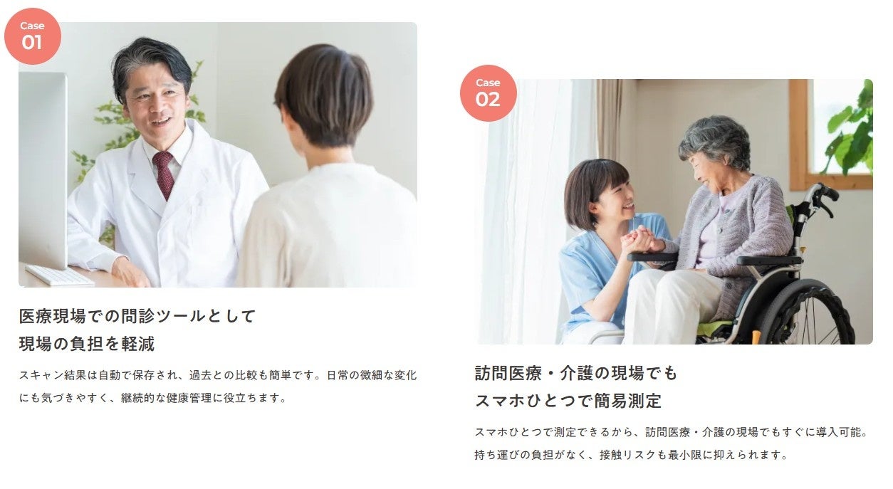 本サービスは、医療機関、クリニック、健診施設、ウェルネス企業等が導入し、その先のエンドユーザー(患者・顧客)に提供する BtoC モデルを採用。導入先を窓口とし、最終利用者に健康チェック体験を届ける構造をとっています。
