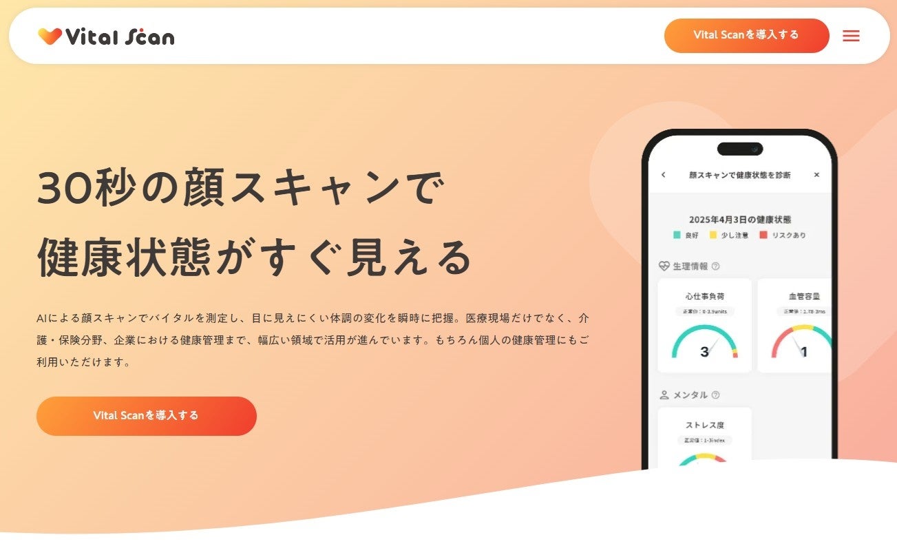 Vital Scanは、スマートフォンのカメラに30秒顔をかざすだけで、バイタル情報(血圧相関、血流パターン、生活習慣病リスクなど)をAIが解析し、スコア化・可視化するサービスです。アプリ不要・Webブラウザでの動作を可能とし、QRコード経由で即時利用できる利便性を持ちます。