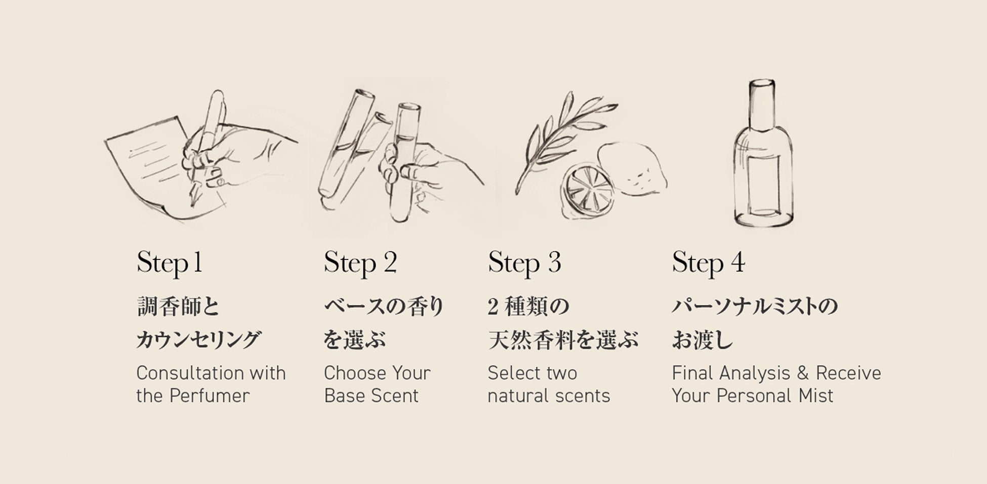 ホテルのロビーやオフィスなど、公共空間の調香を通じて得た知見をもとに開発された「パーソナルブレンディング」は、カウンセリングを通じて今の気分や心の状態を言葉にしながら、16種類の天然香料の中から直感で香りを選び、自分だけのルームミストをつくる体験です。