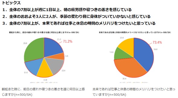 人口構成比に基づき再春館製薬所が実施した調査で浮き彫りになったのは、全体の7割以上が「週に1日以上、起床時に疲れの持ち越しを感じる」という実態(下図)。その結果は、日常的な疲労感や生活リズムの乱れを自覚しつつも、日々の生活をやり過ごさざるを得ない、という、現代人が抱える根深い課題をも映し出します。「就寝直前までのスマートフォン操作」などの一般的に非推奨とされる生活習慣やストレスは、こうした漢方の考え方で言う「不定愁訴」──いわゆる“なんとなく不調”を引き起こすとされますが、再春館製薬所がその根本原因と捉えるのは、人間が生まれながらに持つ「生体リズム」の乱れです