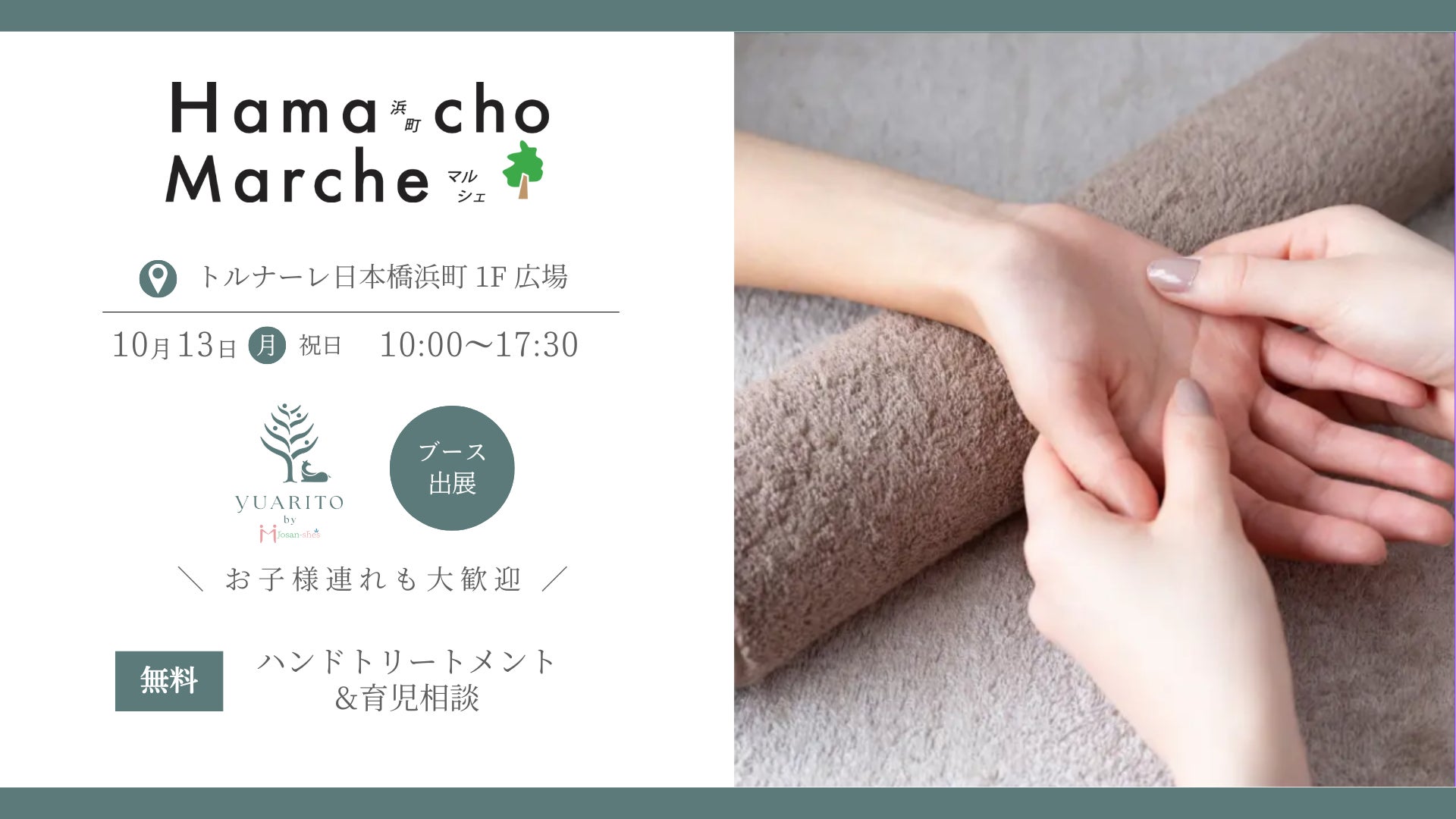 今回 YUARITO DAY のブースでは、妊娠中もしくは未就学児のお子様がいるパパやママのみなさんが少しでもリラックスできるように、「【無料】ハンドトリート メント&助産師による育児相談(5分)」を提供いたします。