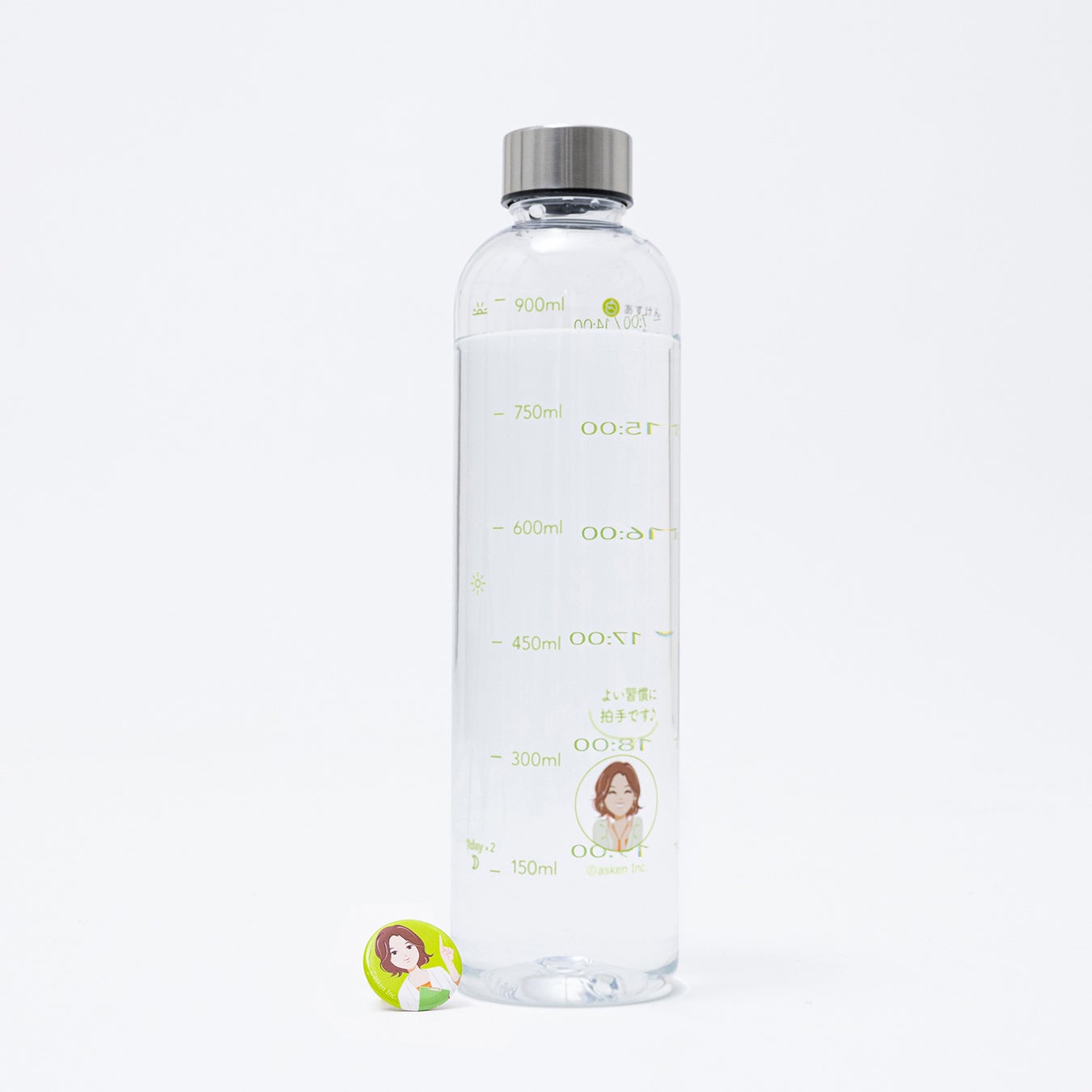 未来さんが毎日の水分補給をサポートしてくれるウォーターボトルと缶バッジがセットになったアイテムです。ボトルの容量はたっぷり約1L。前面は150ml単位のメモリ付き、背面は水分補給のタイミングが確認できる時間のメモリ付きです。飲む時間の目安が明確になるため、適量の水分補給を意識しやすくなります。