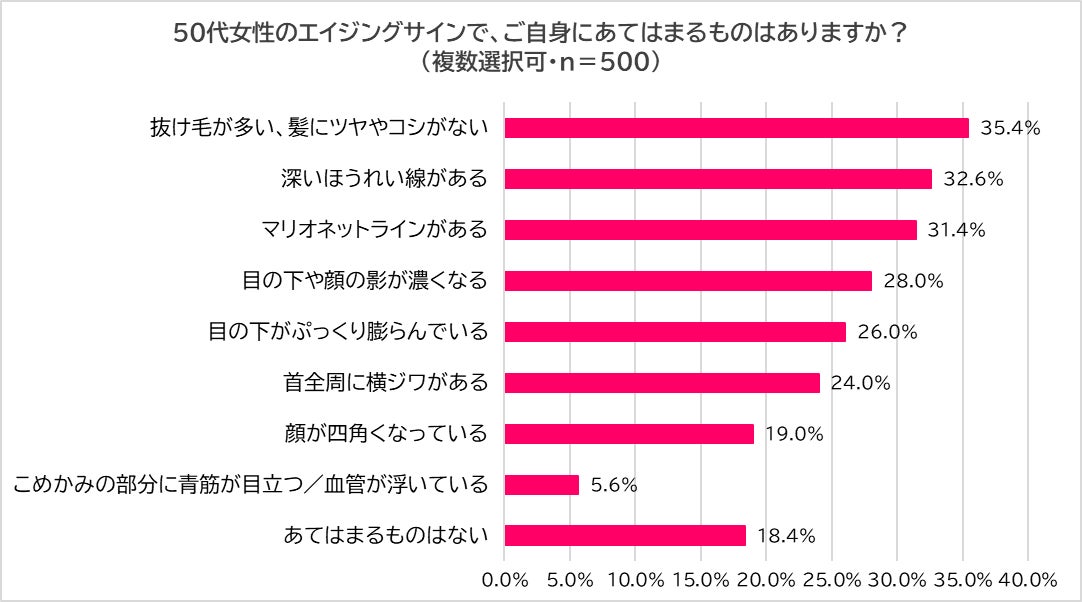 今度は、50代の女性に「50代女性のエイジングの特徴であてはまるものはあるか?」と尋ねたところ、最も多かったのが 「抜け毛が多い、髪にツヤやコシがない」(35.4%) でした。さらに、「深いほうれい線」(32.6%)や「マリオネットライン」(31.4%)も高く、40代よりもシワやたるみが“深刻化”していることが分かりました。また、「目の下や顔の影が濃くなる」(28.0%)や「目の下がぷっくり膨らんでいる」(26.0%)、「顔が四角くなっている」(19.0%)など、たるみによる陰影や輪郭の変化を感じている人も増えていることが分かりました。