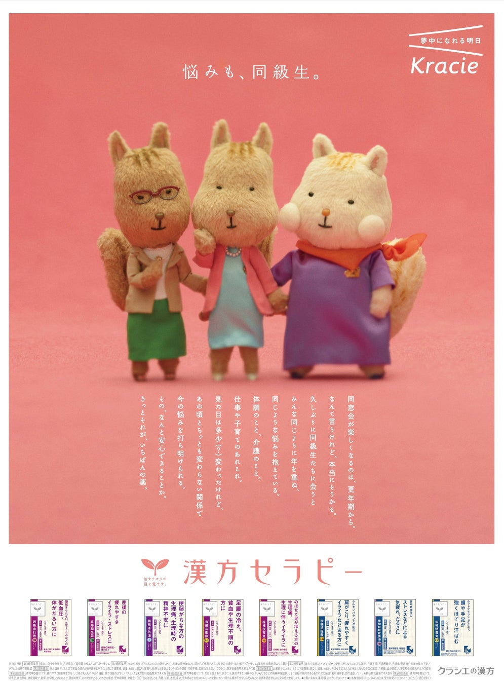 10月18日(土)の「世界メノポーズデー」当日に、日経新聞朝刊にて漢方セラピーの新聞広告を掲載します。CMで話題となった更年期世代のシマリス仲良し3人組が「悩みも、同級生。」という更年期世代に向けた共感のメッセージと共に登場します。また、漢方セラピーシリーズから提供している更年期関連処方を含めた女性の不調にオススメの8処方も紹介しております。