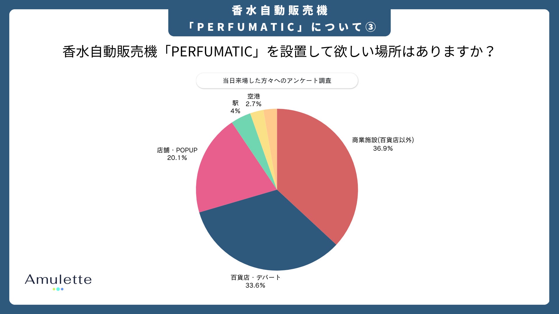 日本初披露となった国際特許取得の香水自動販売機「PERFUMATIC」に関するアンケートでは、来場者の99%が「実際に利用してみたい」と回答。新しい香り体験として、非常に高い関心と期待が寄せられました。