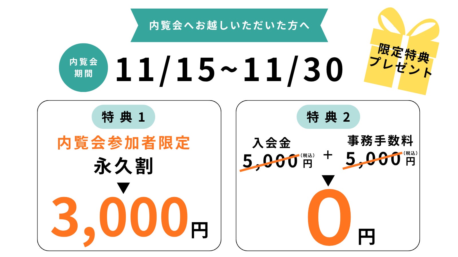 11/15 ~ 11/30 まで先行入会キャンペーン&オープン前内覧会を開催予定