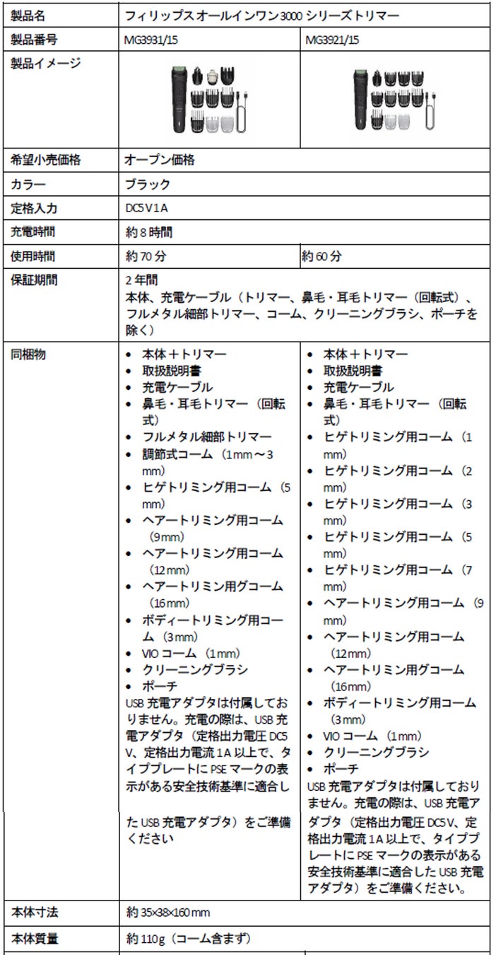 「フィリップス ヒゲトリマー 7000・5000・3000シリーズ」、「フィリップス オールインワン 3000シリーズトリマー」も同日発売