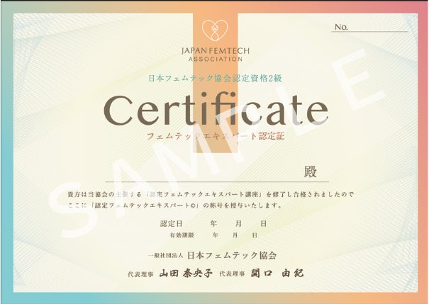 「日本フェムテック協会認定資格2級」は、医師やジャーナリストらによる講座と、知識の定着を図るための試験の二部構成です。プログラムは全てオンラインで期間中に好きなタイミングで受講・受験可能です。女性ならではのライフステージの体と心の変化、働く女性のメンタルケア、フェムテックの基礎といった知識の定着を図るとともに、合格後は「認定フェムテックエキスパート」の称号と合格証を得ることができます。
