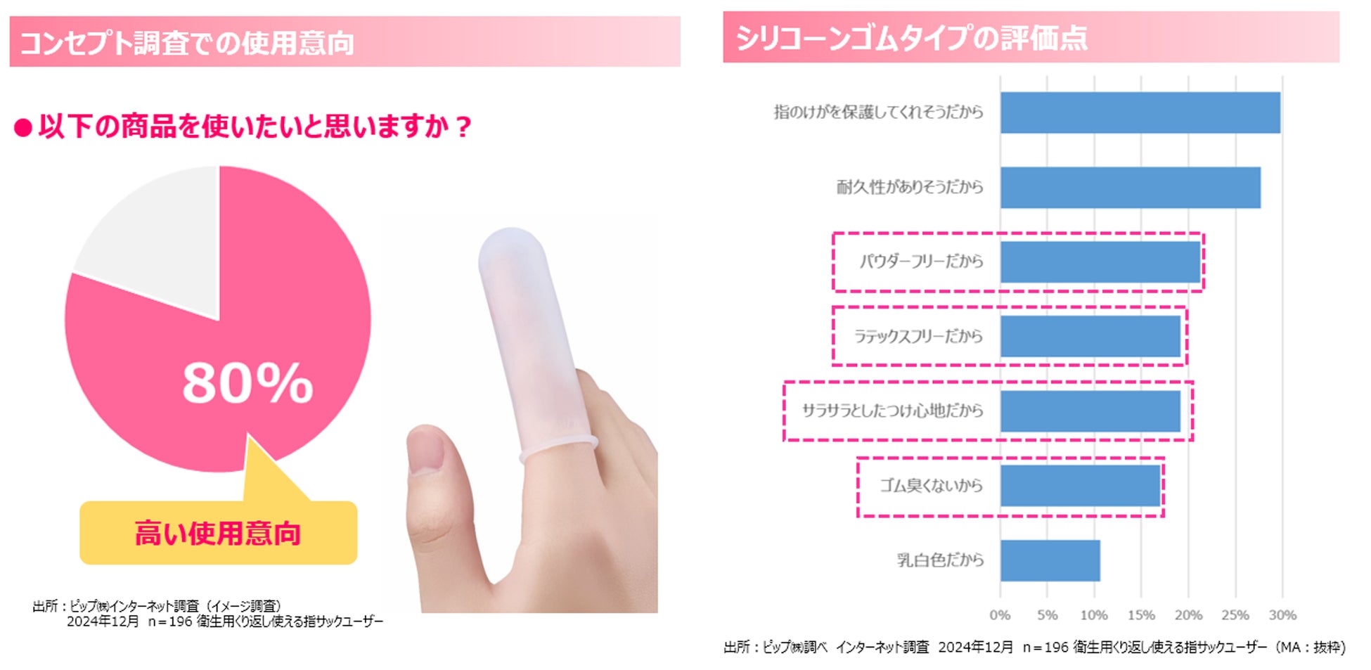 ◆使用したい理由として、シリコーンゴムタイプならではの「パウダーフリー、ラテックスフリー、サラサラとしたつけ心地、ゴム臭くない」との声が多数あり。