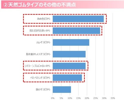また、その他の不満点として、「あめ色だから」「見た目が古臭い」「べた付きそう」など、天然ゴム素材ならではの意見も多いことが判明しました。
