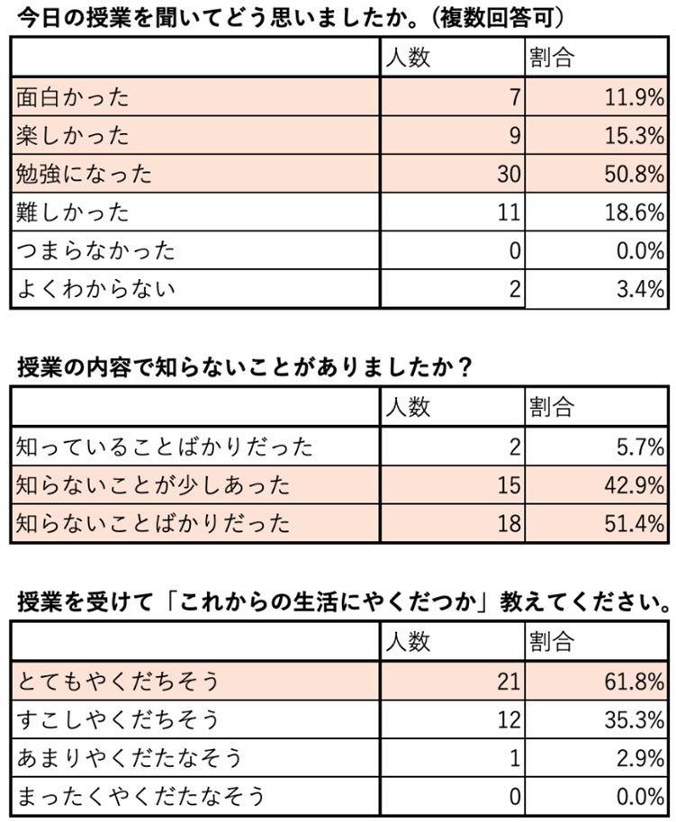 自分(先生)たちでは伝えられない話もしていただいてとてもよかったです。一部の生徒は恥ずかしそうにしている生徒もいましたが、だいたい真剣に聞いていたし、多くの児童は積極的に参加していたようです。また、聞いているだけではなく、グループワークの時間もあり、飽きずに参加できるような工夫をされていてよかったです。