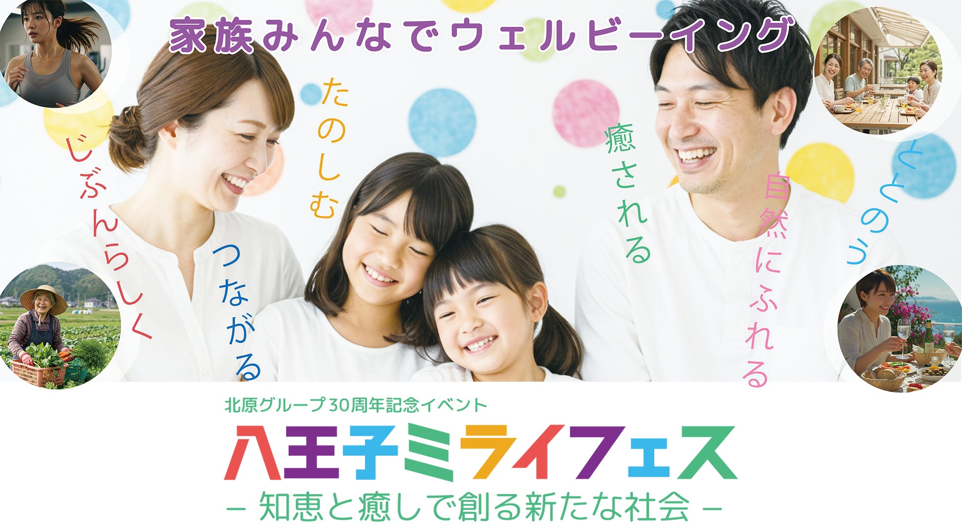 北原グループ(医療法人社団KNI/株式会社KMSI)は、設立30周年の節目にウェルビーイングの未来を体感できる参加型フェス「八王子ミライフェス 2025 ― 知恵と癒しで創る新たな社会 ―」を開催します。