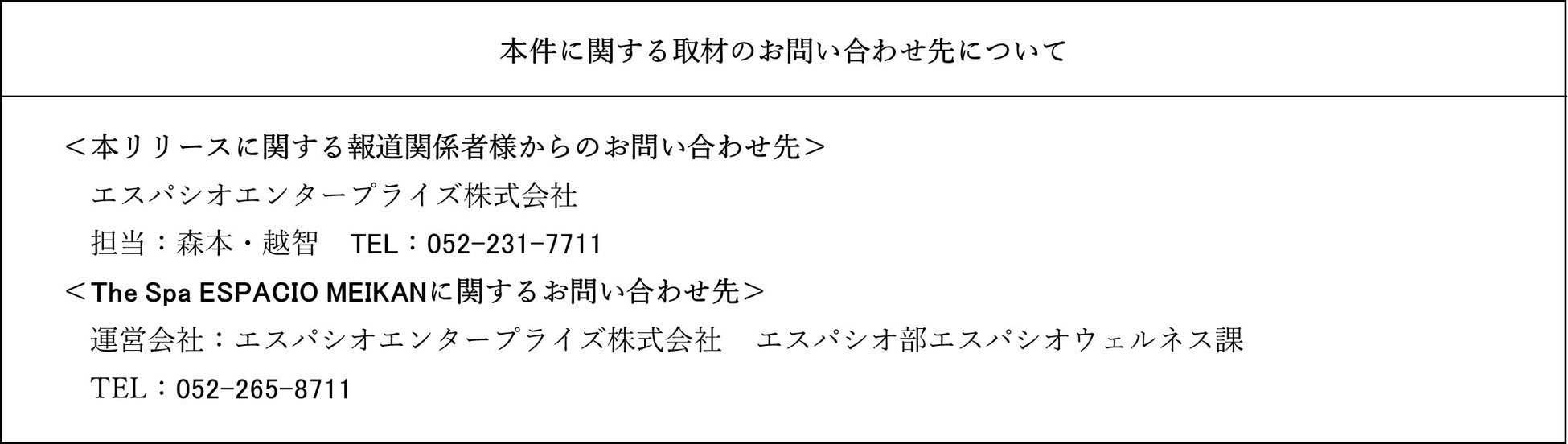 エスパシオエンタープライズ株式会社(所在地:名古屋市中区錦一丁目19番30号、代表取締役社長: 田渕 浩之)が運営する「The Spa ESPACIO MEIKAN(ザ スパ エスパシオ メイカン)」は、2025年10月13日(月)より、営業を開始することをお知らせいたします。