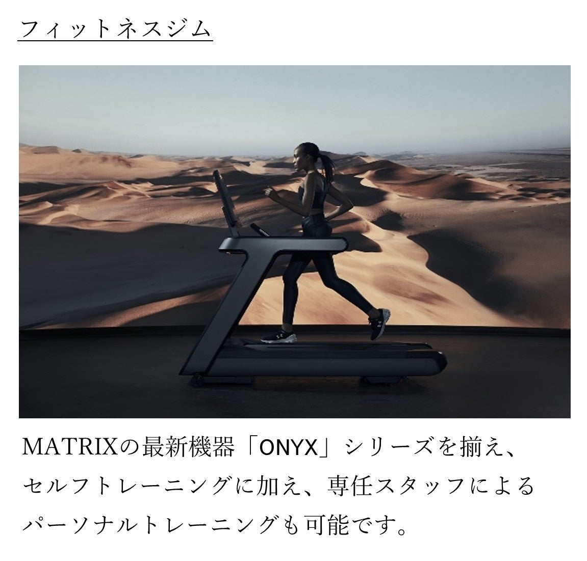 スパトリートメント、プライベートサウナ、フィットネスジム、プール |