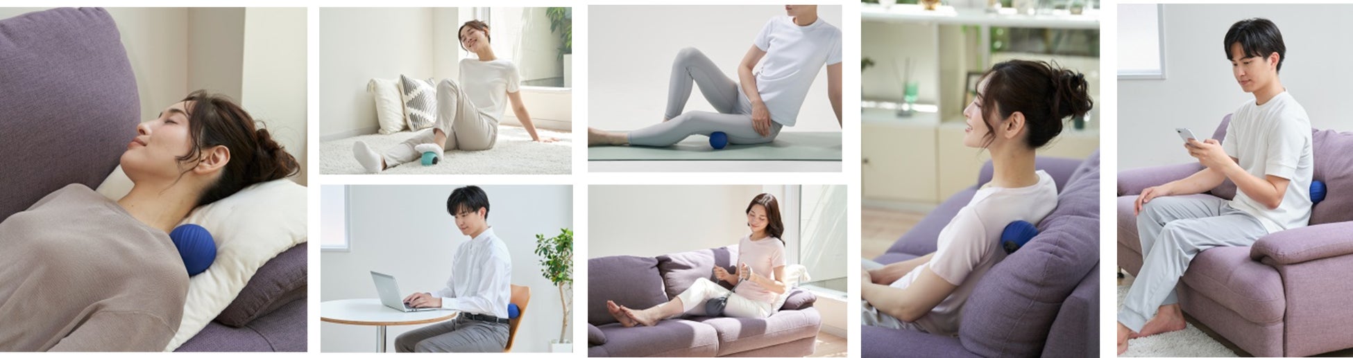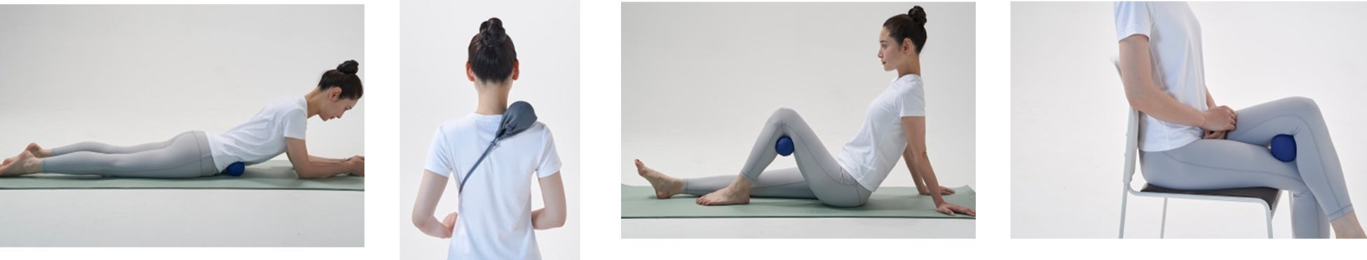 手で持たなくても、もたれたり寝転がったり体重をかけるだけで簡単にケアをすることができます。体重のかけ具合によってカラダへの圧を調整し、自分好みの刺激でケア。球体なので、使い方を限定することなく、様々な部位に使えます。