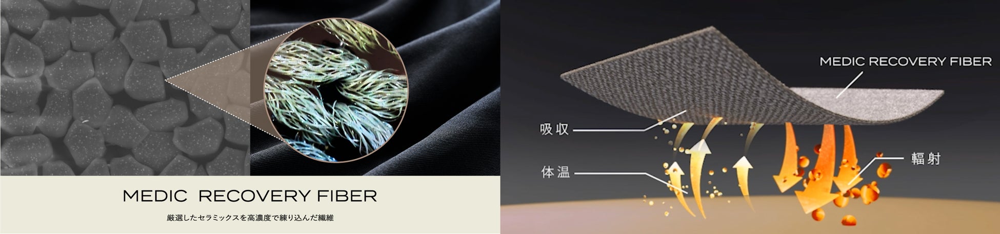 リカバリーシリーズの全アイテムに採用しているのが、独自開発のリカバリー素材「MEDIC RECOVERY FIBER」です。 天然鉱物を原料とする高純度なセラミックスを厳選して数種類ブレンドし、繊維に高濃度に練り込み独自開発した生地です。特殊な糸形状により体温の吸収と遠赤外線放射を高めることで、効果的に体を温め、血行を促進しやすくし、高いリカバリー効果を実現しました。