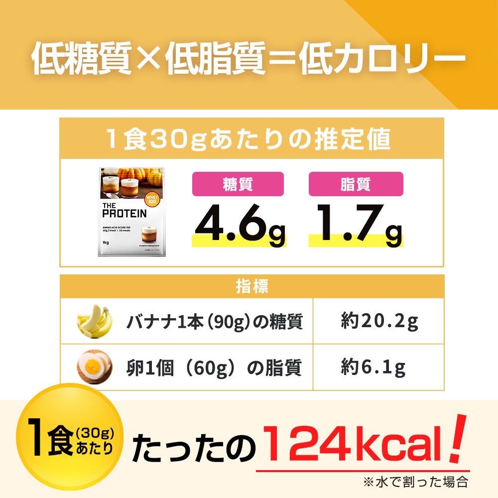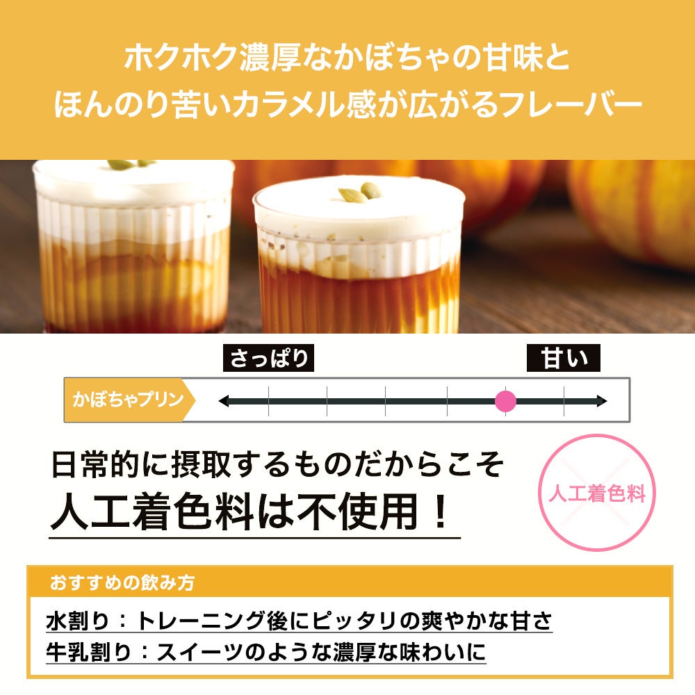 かぼちゃのやさしい甘みとほっくりとした風味に、プリンのなめらかなコクとカラメルのほろ苦さをアクセントとして加えた、スイーツ感あふれるプロテインです。口に含んだ瞬間に広がるかぼちゃの自然な甘さと、後味に残るプリンの香ばしいカラメル感とのバランスが絶妙で、まるでデザートを楽しんでいるかのような満足感を味わえます。