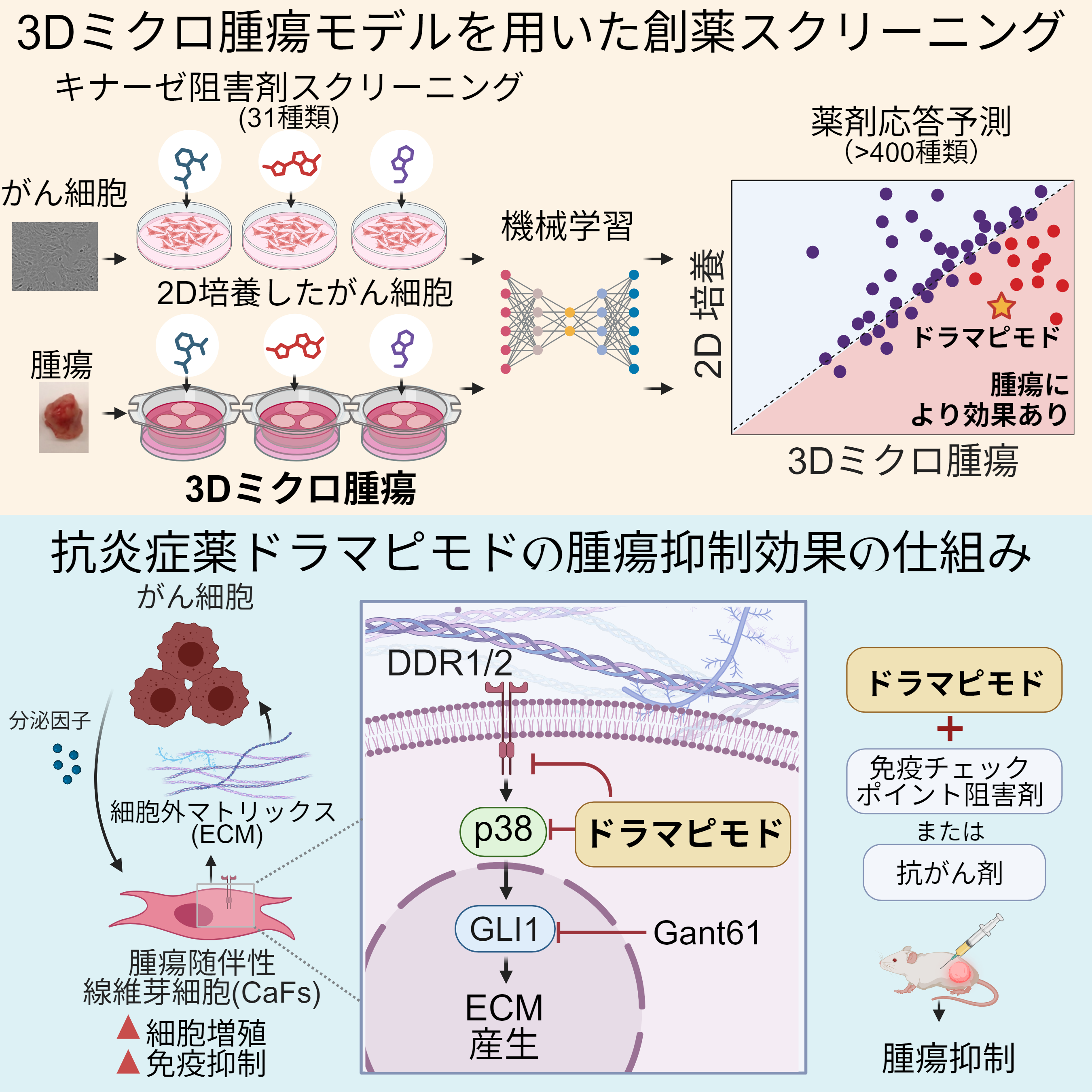 <発表のポイント> ・体内に近い立体的ながん組織(3Dミクロ腫瘍)を使った創薬スクリーニングにより、従来の方法では見逃されていた、がん細胞のまわりにある「サポート役」の細胞の働きを弱める薬を多数発見しました。 ・「ドラマピモド」という薬が、サポート役の細胞の一つである腫瘍随伴線維芽細胞の働きを抑制することでがん増殖を抑え、既存の抗がん剤や免疫治療薬との併用効果を高めました。 ・3Dミクロ腫瘍を用いた創薬スクリーニングは、がん細胞の「サポート役」の細胞を狙い撃つことで治療効果を上げる、新しいタイプのがん治療法の開発につながると期待されます。