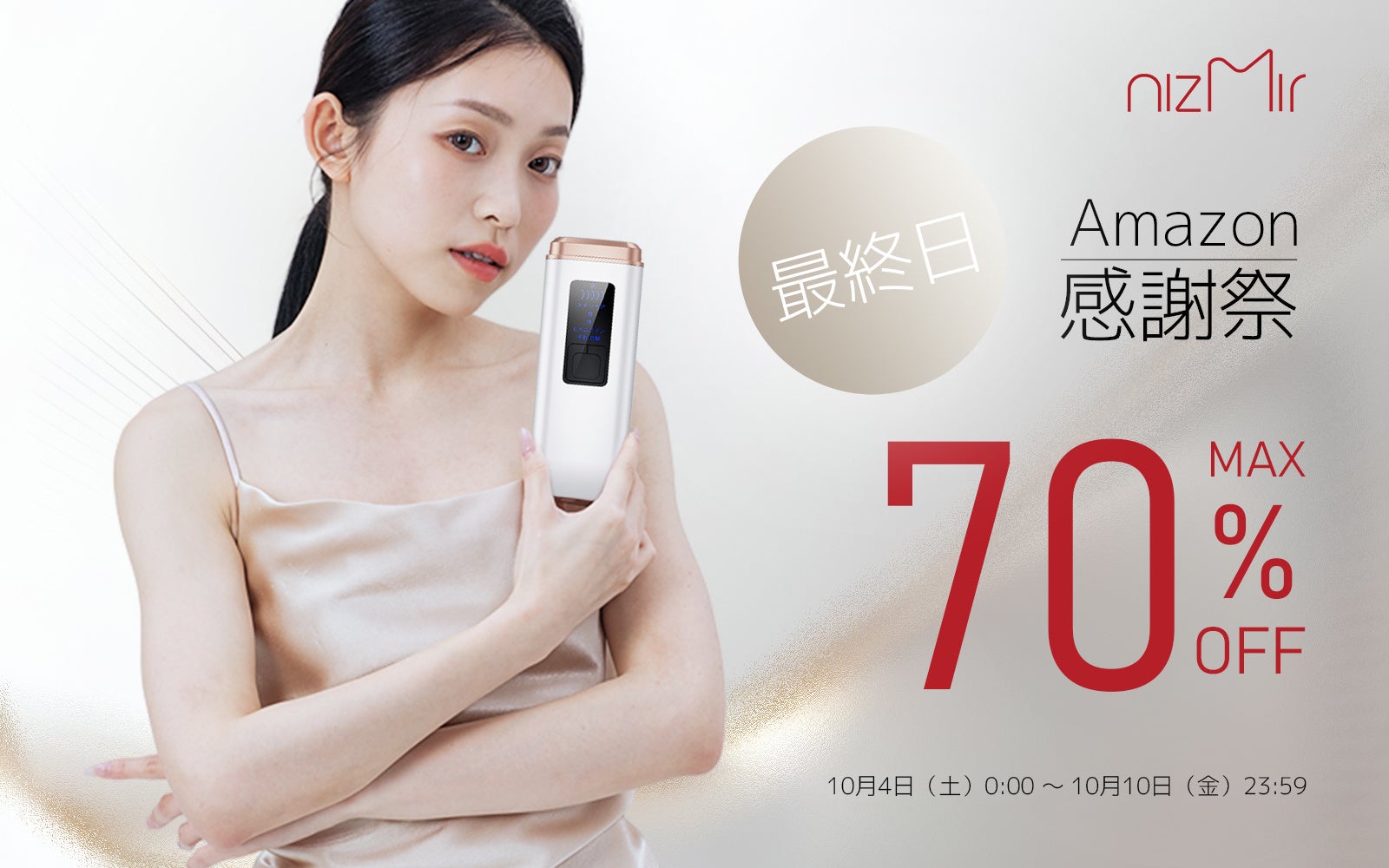 日本で大人気の健康美容家電ブランド「NiZmir」は、10月7日(火)から10月10日(金)まで開催される『Amazon感謝祭』に先行し、10月4日(土)0時00分より、主要オンラインストアにて「NiZmir IPL冷感脱毛器」を42%OFFの特別価格で販売いたします。さらに、Amazon感謝祭最終日10月10日(金)は、NiZmirをいつもご愛顧いただいているお客様に、感謝を込めて70%OFFの限定価格をご案内いたします。