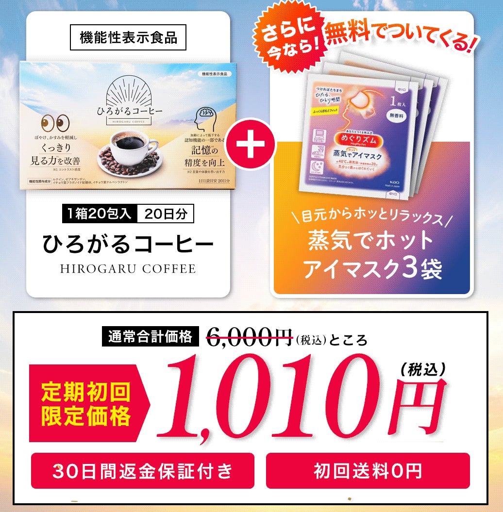 「目の愛護デー」は、数字の「10・10」を横に並べると「人の目」のように見えることから、“目の健康を見つめ直す日”として制定されました。期間中は、目※1と記憶※2の機能をサポートする機能性表示食品コーヒー『ひろがるコーヒー』を定期初回限定1,010円(税込)でお試しいただけるほか、「めぐりズム 蒸気でホットアイマスク」3枚をプレゼント。