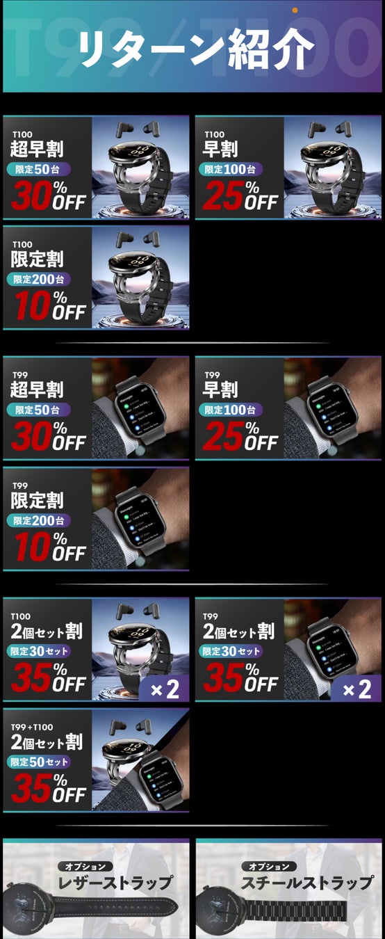 Smiley Partner LLC(本社:大阪市北区)は、スマートウォッチ本体に高音質ワイヤレスイヤホンを内蔵した革新的デバイス「T99(スクエア型)/T100(ラウンド型)」を、クラウドファンディングサイト「machi-ya」にて、2025年10月10日12時より先行販売を開始します。
