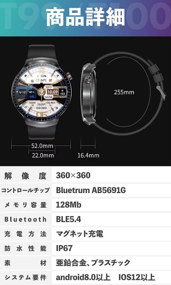 製品名AIスマートウォッチ T99/T100通信方式Bluetooth 5.3AI機能ChatGPT 音声アシスタント対応健康機能心拍数・血中酸素・血圧・睡眠・女性周期管理通話機能内蔵マイク・