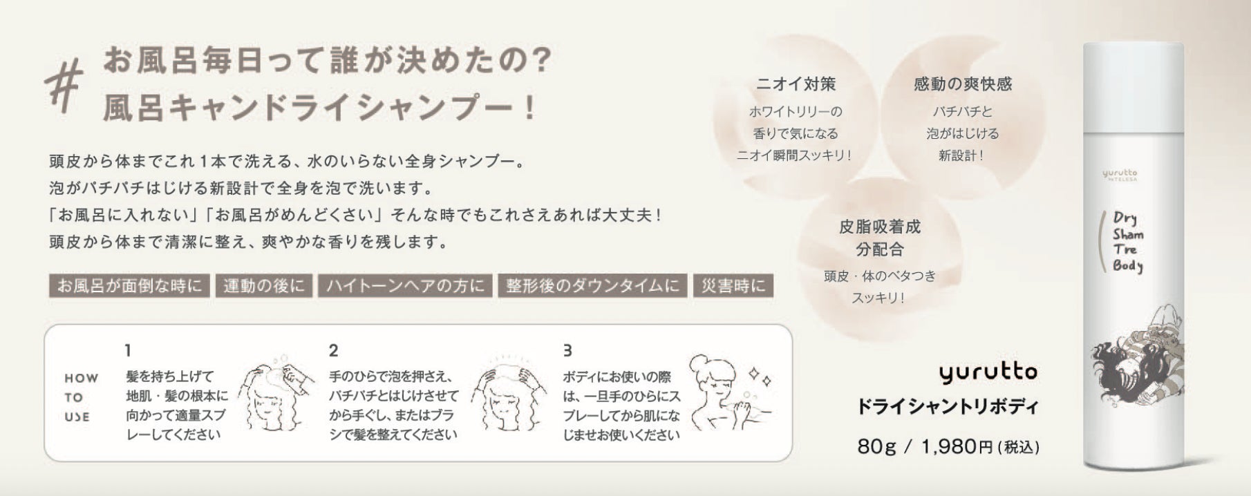 第一弾として登場するのは、洗い流し不要の全身用ケアアイテム「ドライシャントリボディ」。