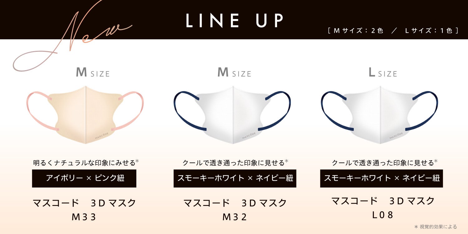 株式会社サン・スマイル(本社:東京都港区/代表取締役社長:田中徳也)はファッション性と機能性を両立させたマスクブランド『MASCODE(マスコード)』の3Dシリーズより、EC限定カラー(全2色、Mサイズ2色、Lサイズ1色)を10月14日(火)からサン・スマイル公式サイト(https://sunsmarche.jp/shop/pages/mascode)にて新発売します。今回の新色はお客様アンケートにて人気No.1とNo.2を獲得した期待の2色となります。