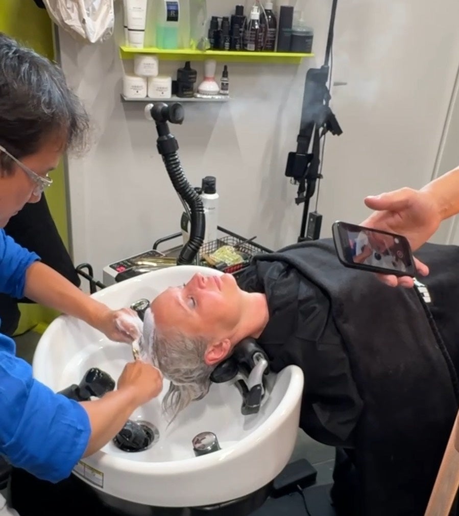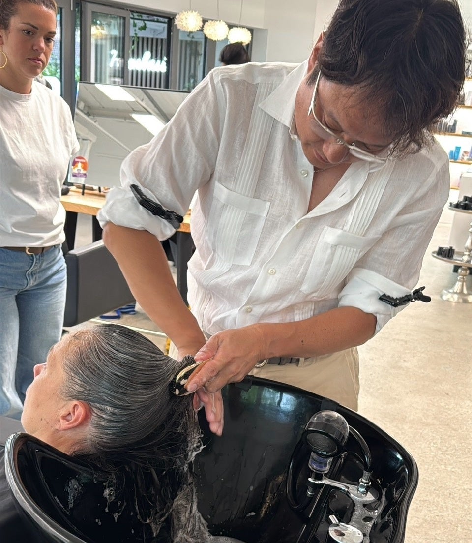 海外サロンにて、スカルプシャンプーブラッシングのデモンストレーションを行う代表の木下
