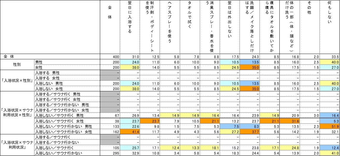 【入浴状況×サウナ利用状況×性別】別でみると、「何もしない」について入浴もサウナもしない男性層で、5割いたが、入浴もサウナもしない女性層では、3割強と約20ptの差があった。