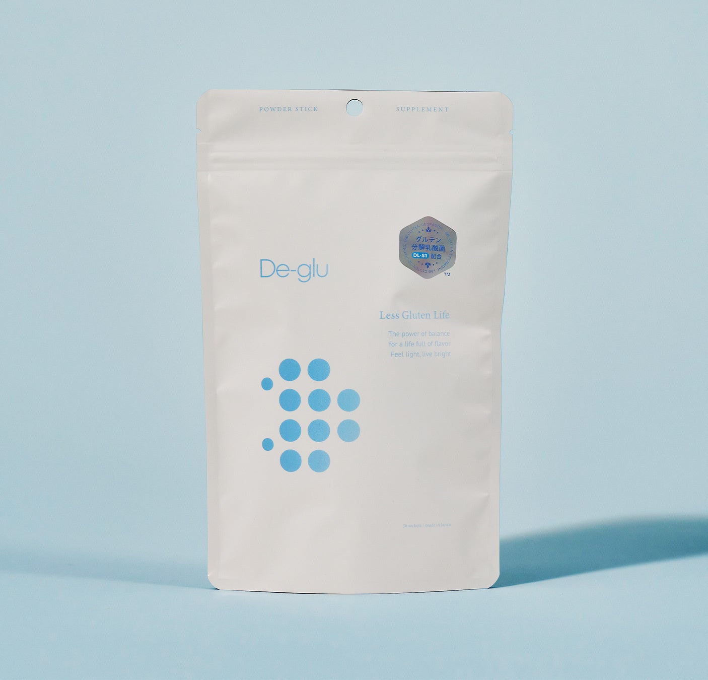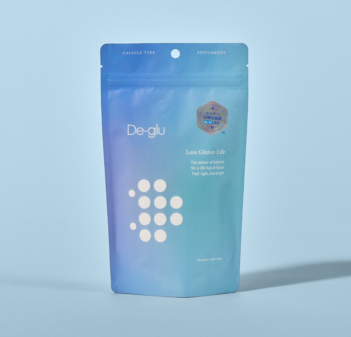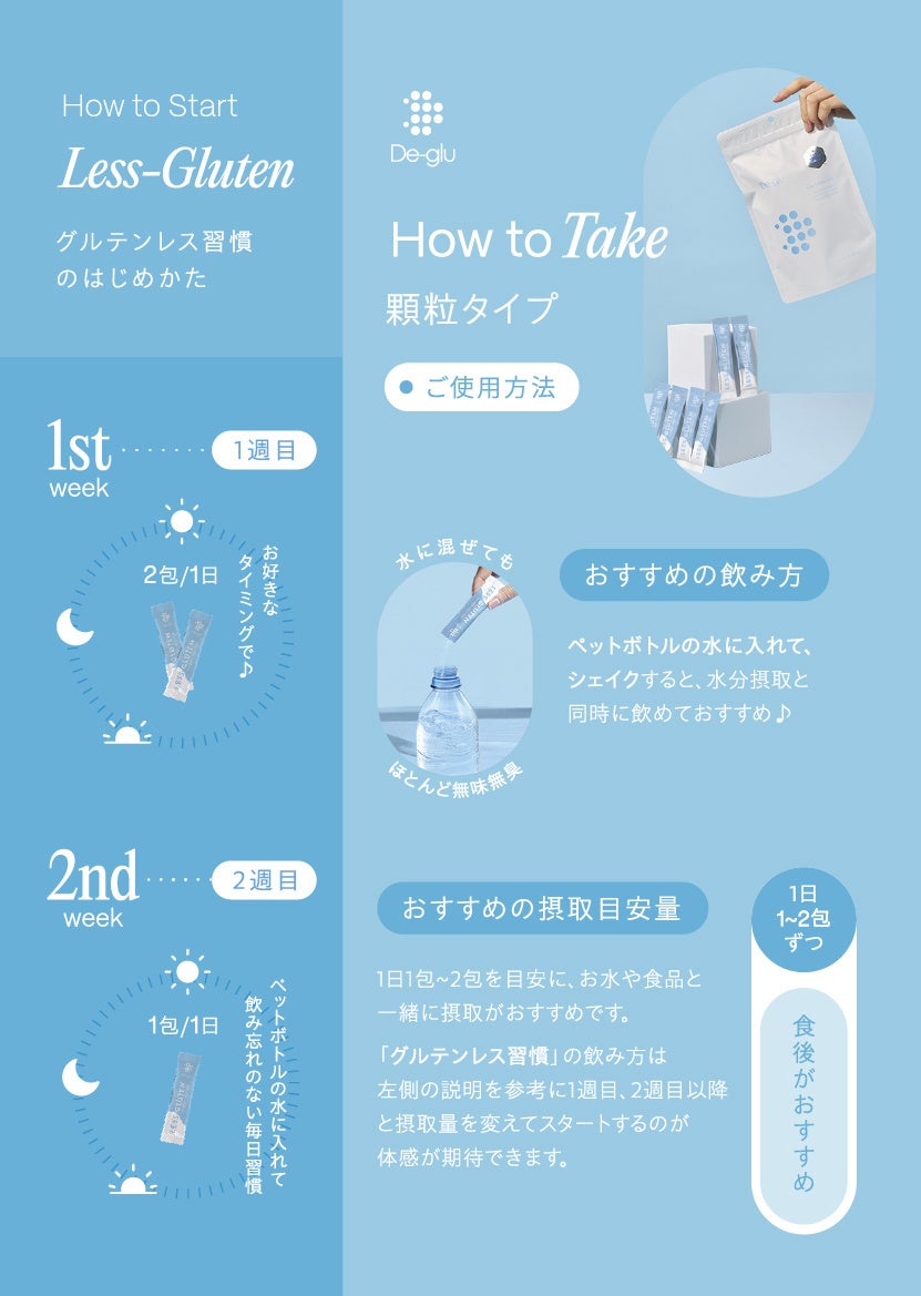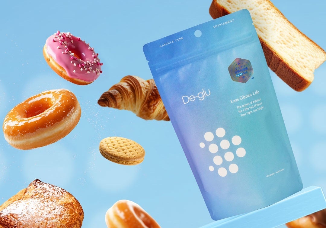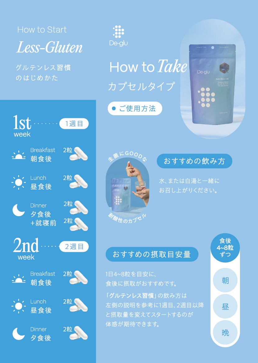 「De-glu(デグル)」は、韓国の伝統的な発酵食品から発見・開発された最大約70%のグルテン分解機能を持つ乳酸菌(※1)を配合した自社ブランドのサプリメントです。幅広いシーンでご使用いただけるよう、カプセルタイプと顆粒タイプの2種で展開しています。
