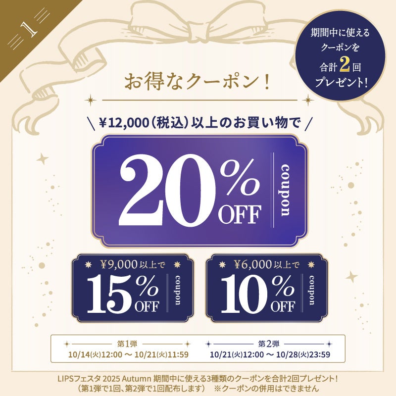 2025年10月14日(火)12:00から開始した「LIPSフェスタ 2025 Autumn」では、3種類のお得なクーポンをLIPSアカウントをお持ちの方全員に配布します。また、ヘアケア・スキンケアアイテムのサンプルを購入者限定で配布するなど、ご愛顧いただく多くの方に喜んでいただける企画をご用意。