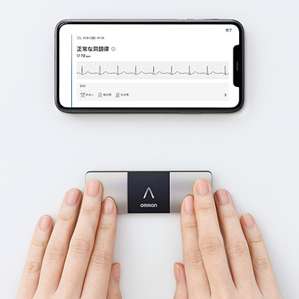 ・スマートフォンアプリ「OMRON connect(オムロンコネクト)」で心電図波形を解析。「心房細動の可能性」など6パターンの解析結果をお知らせ