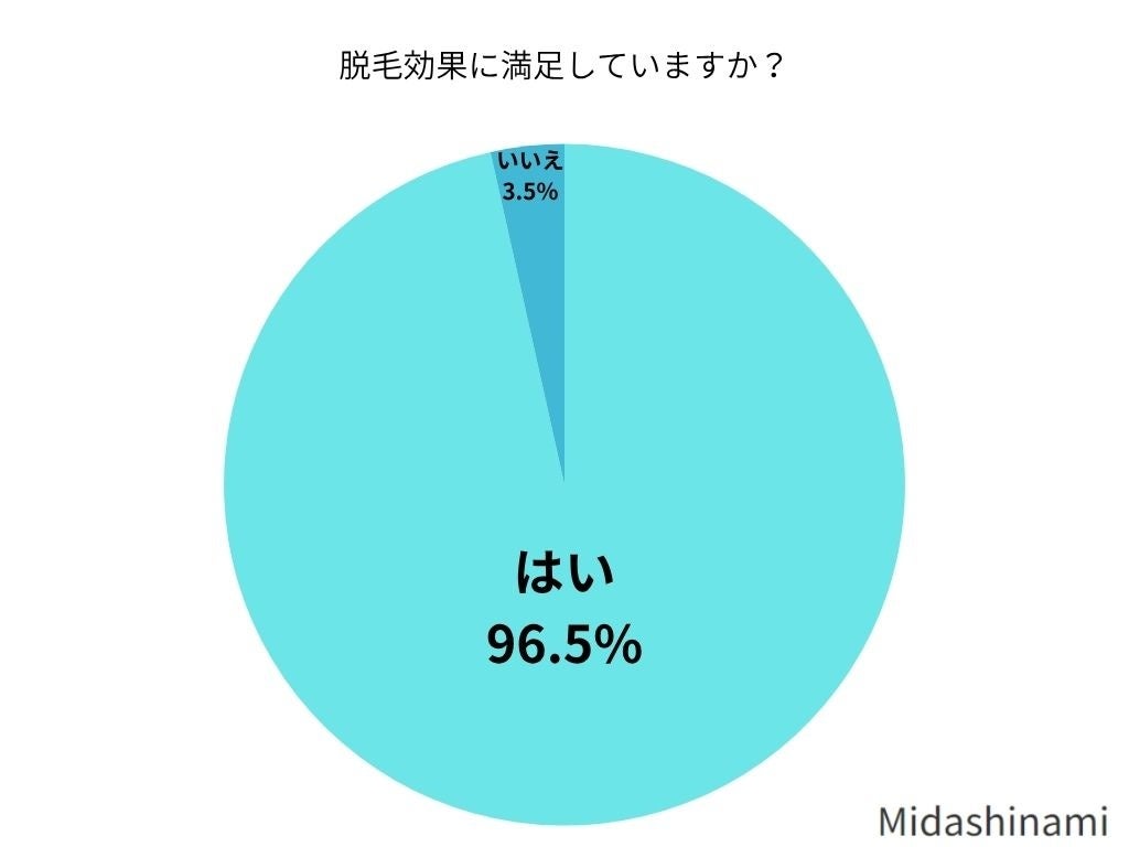 また、メンズ脱毛経験者に「脱毛効果に満足していますか?」と質問をしたところ、96.5%が「はい」と回答しました。一方で「いいえ」と答えたのはわずか3.5%にとどまり、ほとんどの男性が脱毛の効果に満足していることが分かります。