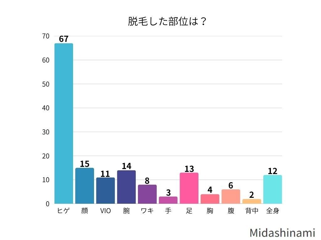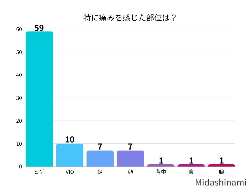 特に痛みを感じやすい部位は「ヒゲ」(59票)と「VIO」(10票)。この2つは毛が太く濃いため、照射時に強い刺激を感じやすいです。