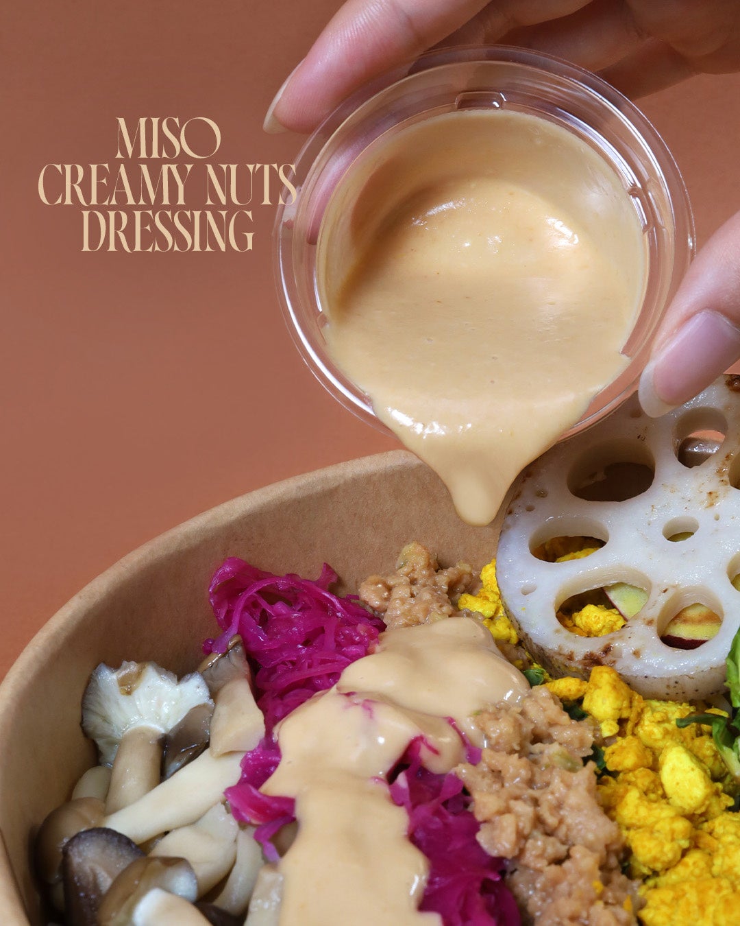 サラダの味を引き立てるのは、THE_B特製のドレッシング「MISO Creamy Nuts(ミソ・クリーミーナッツ)」。日本の発酵食品の代表格”味噌”をベースに、タンパク質やビタミン、ミネラルを豊富に含んだ”ピーナッツバター”も使用し、仕上げました。甘しょっぱさと、ほんのり効かせた酸味がクセになる味わいで、毎日の美容や健康を意識する方にもおすすめです。