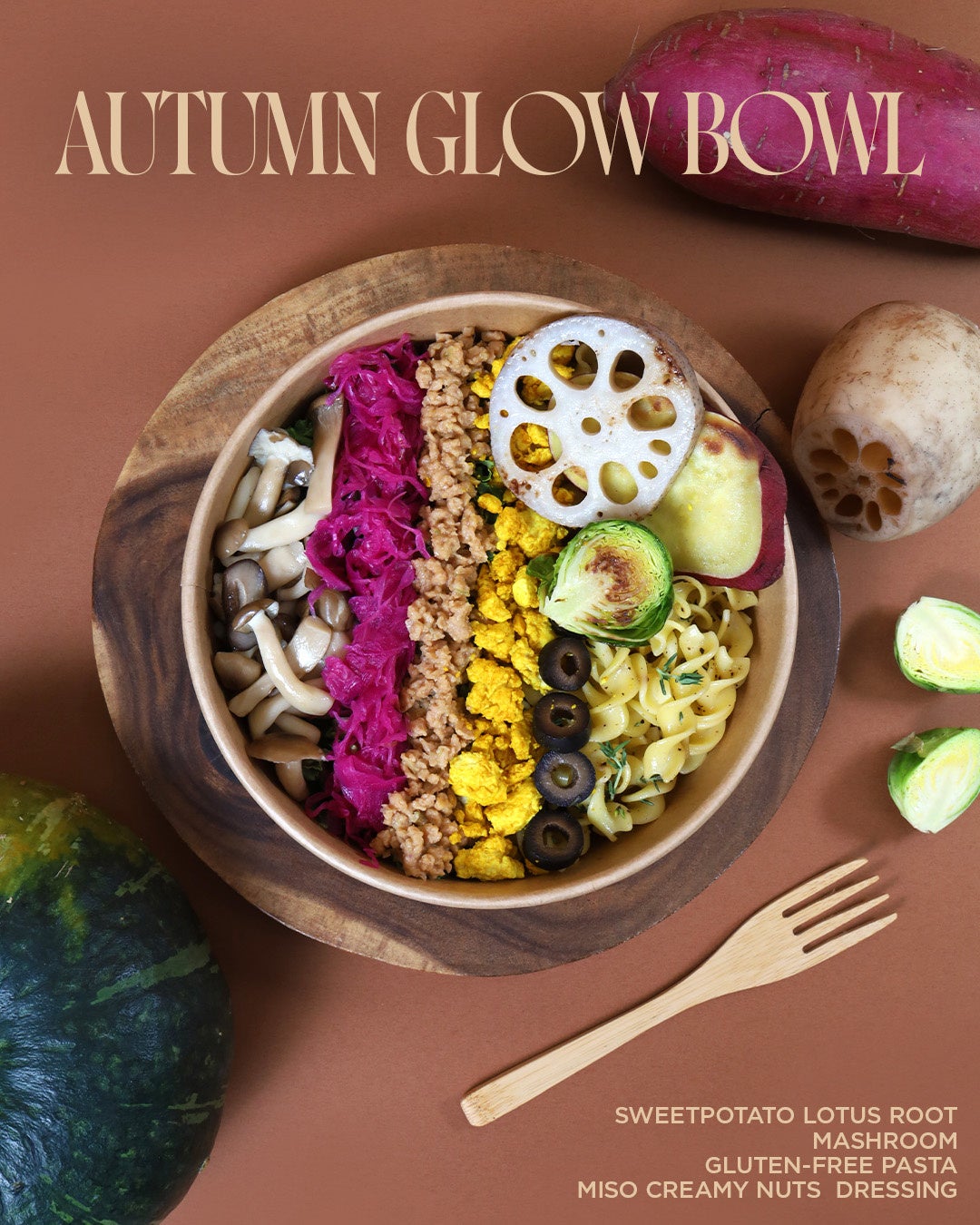 主役は、香ばしくグリルしたさつまいもやれんこん、芽キャベツ、そしてジューシーなきのこなどの栄養満点の彩り豊かな秋野菜たち。消化に優しくアレルギーの方でも楽しめるグルテンフリーパスタを使用し、しっかりと満足感がある一品です。ホクホク、シャキシャキ、ジューシーと、食感のバリエーションも豊か。旬の味覚とバランスの取れた素材の組み合わせが、季節の変わり目にやさしく寄り添います。食欲の秋を、THE_B特製サラダボウルでヘルシーにお楽しみください。